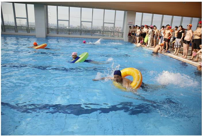 笑闹之后赛程进入最后环节:花样接力赛。每队选派4名队员完成4×50米接力。蛙泳、蝶泳、仰泳、自由泳,各类泳姿在泳池中激起了翩翩浪花。此项环节的重头戏在于每组需有一名队员全程套着游泳圈完成!这可难倒了游泳健将们,于是,有的便开启了长久的原地圆周运动模式,队友不得不下水接应。