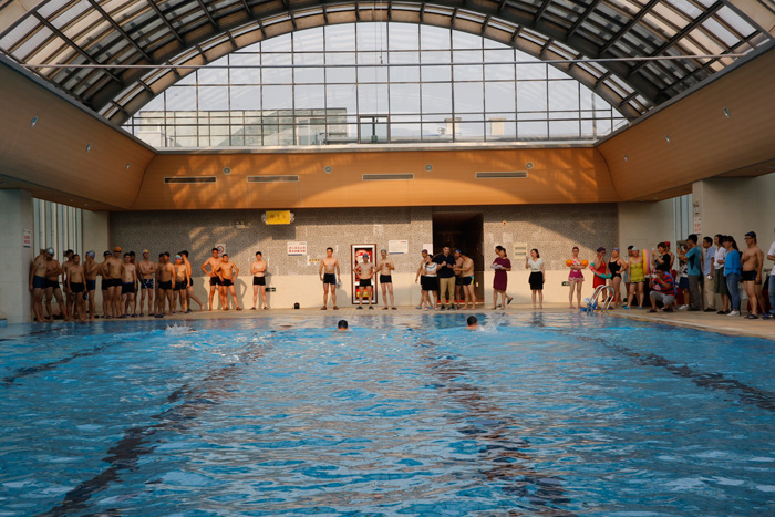 男子组在裁判的哨声中首先亮相。泳池里浪花翻腾,人影起伏。选手们奋勇拼搏,用各种泳姿展现强健的体魄。“拉拉队”不时地欢呼雀跃,为本部门的选手呐喊助威。工作人员也积极协调维持现场秩序,确保比赛顺利进行。