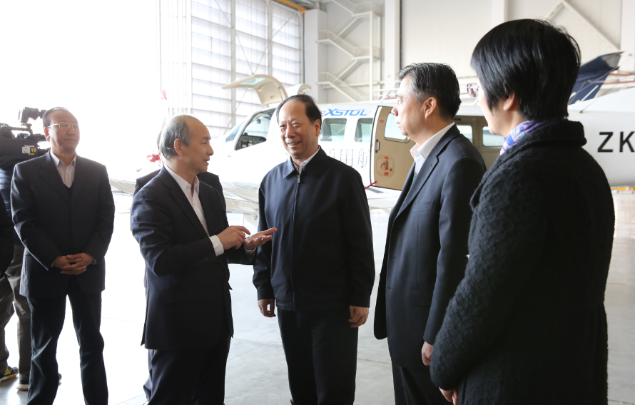 石泰峰一行首先登上了由宇航自行设计、改装的CRJ—200公务机,参观了驾驶舱、客舱,了解飞机内部构造和改装创新过程。随后来到宇航机库,实地考察并详细了解了宇航的发展情况和战略规划。